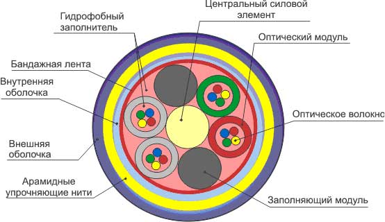 ![]() 1. Центральный силовой элемент; 2. Оптический модуль; 3. Оптическое волокно; 4. Гидрофобный заполнитель; 5. Бандажная лента; 6. Внутренняя оболочка; 7. Арамидные упрочняющие нити; 8. Внешняя оболочка. |