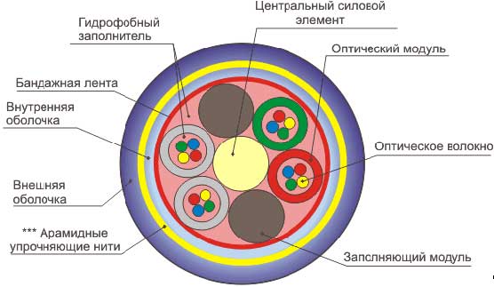 ![]() *** - по согласованию с Заказчиком. 1. Центральный силовой элемент; 2. Оптический модуль; 3. Оптическое волокно; 4. Гидрофобный заполнитель; 5. Бандажная лента; 6. Внутренняя оболочка; 7. Арамидные упрочняющие нити (при необходимости); 8. Внешняя оболочка. |