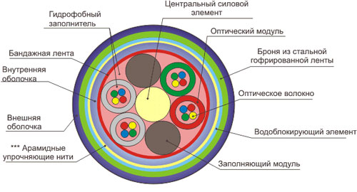 ![]() 1. Центральный силовой элемент; 2. Оптический модуль; 3. Оптическое волокно; 4. Гидрофобный заполнитель; 5. Бандажная лента; 6. Внутренняя оболочка; 7. Водоблокирующий элемент; 8. Броня из стальной гофрированной ленты; 9. Внешняя оболочка. |