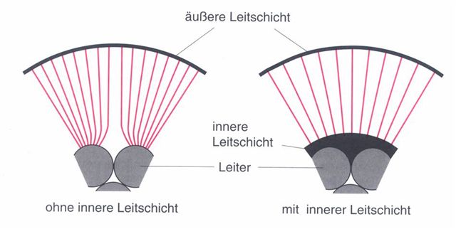 Сшитый полиэтилен - чисто изоляционный материал, полупроводящий полиэтилен - полиэтилен со специальными добавками применяется для полупроводящих экранов. Накладываются на жилу в три слоя одновременно на протяжении одной операции: п/п слой жилы-изоляция-п/п слой по изоляции. Помогают равномерно распределить силовые линии электрического поля по окружности изоляции в радиальном направлении, тем самым убирая участки напряженности.