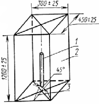 Испытательная камера длиной (450±25) мм, шириной (300±25) и высотой (1200±25) мм без передней стенки. Все стенки камеры должны быть изготовлены из металла, а дно защищено слоем асбеста или другого теплозащитного материала (черт. 1).