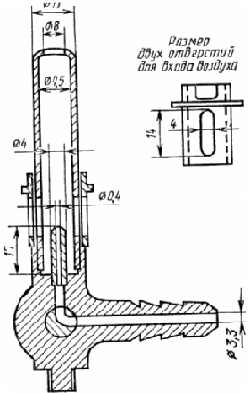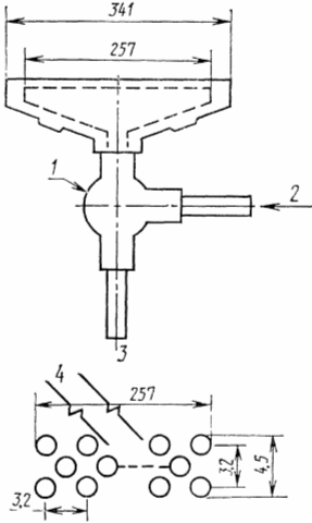 1-смеситель типа Вентури для воздуха и газа; 2-вход газа; 3-вход сжатого воздуха; 4-элементы горелки <>Черт. 8