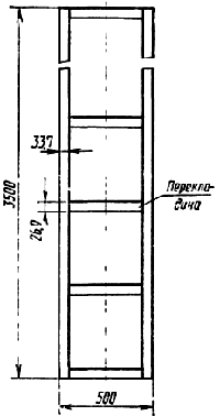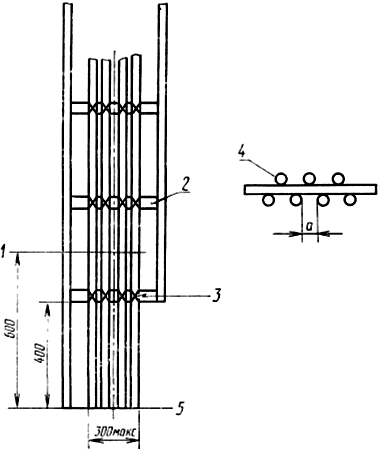 3.1.4. Каждый отрезок кабеля прикрепляют с помощью проволоки к перекладинам приставной стальной лестницы с числом перекладин, равным девяти (черт. 4). Общая ширина прикрепленных образцов кабеля должна быть не более 300 мм. Испытуемый образец должен располагаться по центру лестницы.