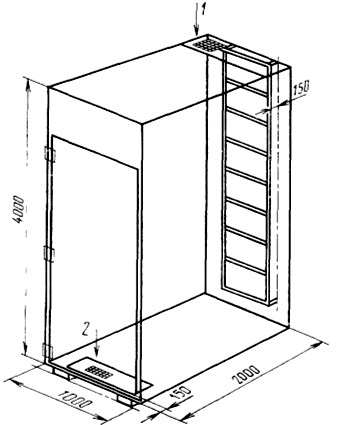 Стенки камеры должны быть выполнены из стальных листов толщиной 1,5-2,0 мм и иметь термоизоляцию толщиной не менее 65 мм с коэффициентом теплопередачи (0,7±0,1) Вт/м2 С (черт. 7).