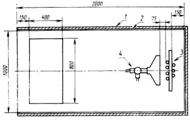 1-термоизоляция; 2-стальная плита; 3-испытуемый образец на лестнице; 4-испытательная горелка