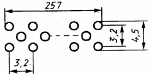 Источником воспламенения являются одна или две пропановые газовые горелки ленточного типа с индивидуальными расходомерами и смесителями Вентури. Рабочая часть горелки в виде плоской металлической пластины длиной (341±5) мм и шириной (30±5) мм имеет 242 отверстия диаметром (1,32±0,03) мм, расположенных на расстоянии 3,2 мм друг от друга ступенчато тремя рядами по 81, 80 и 81 отверстий в каждом, при этом образуется прямоугольник с номинальными размерами (257±5) х (4,5+0,5) мм, как показано на рисунке 4. Поскольку отверстия в пластине могут высверливаться без применения специального инструмента, допускаются небольшие отклонения от указанного межцентрового расстояния. Кроме того, на каждой стороне пластины могут быть высверлены небольшие вспомогательные отверстия, обеспечивающие поддержание зажженного пламени.