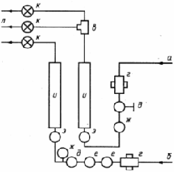 а - впуск пропана; б - впуск воздуха; в - редукционный Т -образный клапан; г - открывающий/закрывающий клапан; д - регулятор давления; е - фильтр; ж - манометр, з - контрольный клапан, и - расходомер (ротаметр); к - клапан соленоидного типа; л - контрольная линия (допускается не применять).