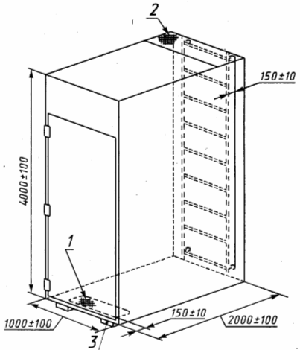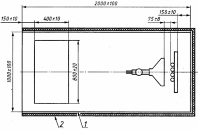 Испытательная установка (рисунок 1) представляет собой вертикальную испытательную камеру шириной (1000±100) мм, глубиной (2000±100) мм и высотой (4000±100) мм; пол камеры должен быть приподнят над уровнем земли. Стыки стенок камеры должны быть воздухонепроницаемыми. Воздух должен свободно поступать через отверстие размерами (800±20) х (400± 10) мм, находящееся в полу камеры на расстоянии (150± 10) мм от ее передней стенки.