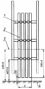Выходное отверстие размерами (300±30) х(1000±100) мм должно быть в задней части верха испытательной камеры. Задняя и боковая стенки камеры должны иметь термоизоляцию, обеспечивающую коэффициент теплопередачи около 0,7 Вт/(м2 · К). Например, для стального листа толщиной 1,5-2,0 мм достаточно покрытие слоем асбестовой ваты толщиной 65 мм (рисунок 1а). Расстояние между лестницей и задней стенкой камеры - (150±10) мм, а от нижней перекладины лестницы до пола - (400±5) мм. Расстояние от самой нижней точки образца до пола камеры должно быть около 100 мм (рисунок 3).