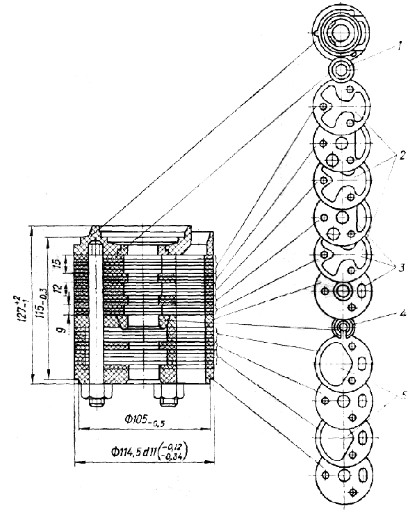 Над токосъемным устройством на распорном цилиндре 11 установлена дугогасительная камера 12 поперечного масляного дутья. Дугогасительная камера состоит из пакета изоляционных перегородок, стянутых тремя шпильками. Верхняя перегородка камеры имеет сменное кольцо 1 (Рис.2) из дугостойкого материала, которое при сильном обгорании можно заменить, не меняя при этом перегородку. Камера имеет центральное отверстие для прохода подвижного стержня. В верхней части камеры изоляционные перегородки образуют три поперечные, расположенные одна над другой, дутьевые щели 2 для гашения больших токов, связанные сквозным вертикальным каналом 3 с подкамерным и надкамерными пространствами. В нижней части камеры имеются два глухих масляных кармана 5 для гашения малых токов. Конусная вилка 4, установленная в средней части камеры, предотвращает подвижный стержень от чрезмерного разгона под действием высокого давления, возникающего при отключении токов короткого замыкания.
