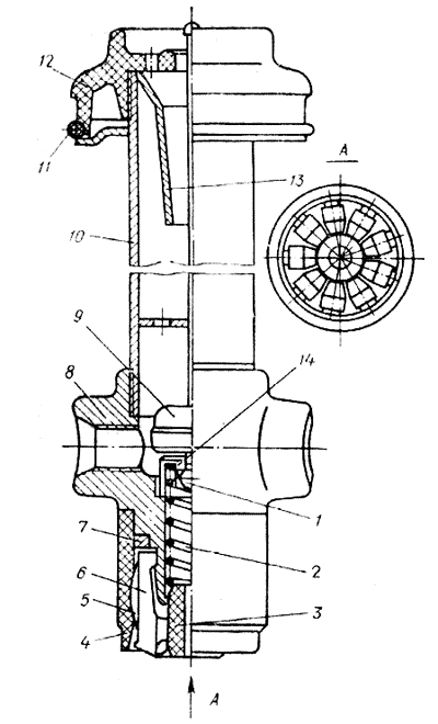 1 – шарик; 2 – пружина; 3 – толкатель; 4 – цилиндр; 5 – пружина; 6 – ламель; 7 – обойма; 8 – основание; 9 – поплавок со стержнем указателя; 10 – труба; 11 – уплотнение; 12 – крышка; 13 – воронка; 14 – клапан.