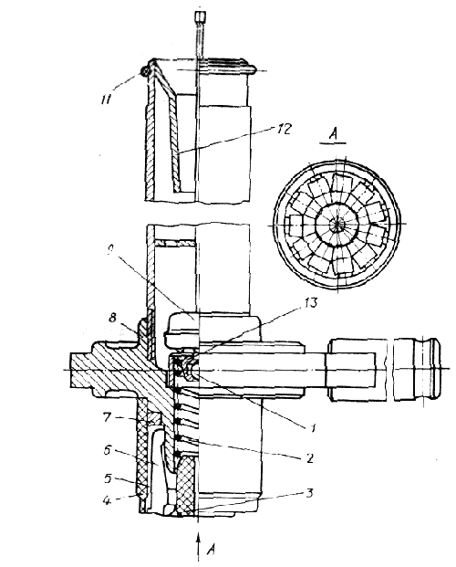 1 – шарик; 2 – пружина; 3 – толкатель; 4 – цилиндр; 5 – пружина; 6 – ламель; 7 – обойма; 8 – основание; 9 – поплавок со стержнем указателя; 10 – труба; 11 – уплотнение; 12 – воронка; 13 – клапан.