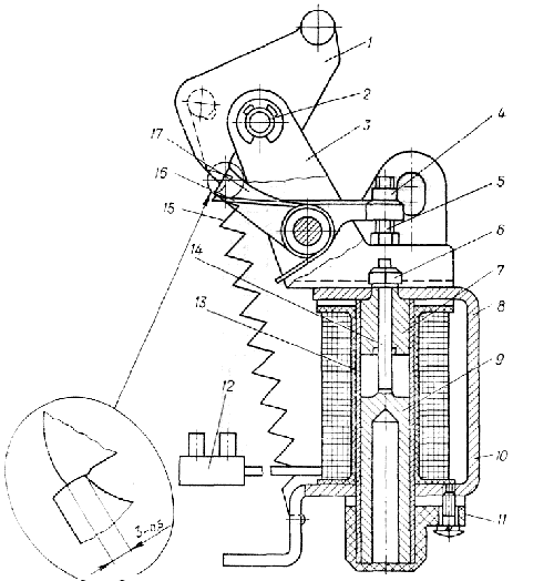 Наружные рычаги 11 вала механизма полюса, связанные общей тягой 12, соединены с отключающей пружиной 17 и регулируемой тягой 15 с рычагом 18 привода выключателя.
