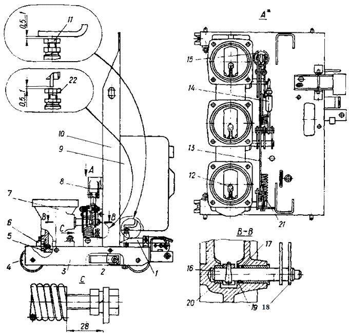 1 – педаль; 2 – контакт заземляющий; 3 – рама; 4 – колесо; 5 – прокладка; 6 – пробка маслоуказательного отверстия; 7 – корпус механизма полюсов; 8 – рычаг вала выключателя; 9 – привод; 10 – стойка; 11 – болт; 12 – рычаг механизма внутренний; 13 – тяга; 14 – тяга регулируемая; 15 – буфер масляный; 16 – вал механизма; 17 – уплотнение; 18 – рычаг механизма наружный; 19 – шайба затяжная; 20 – подшипник; 21 – пружина отключающая.