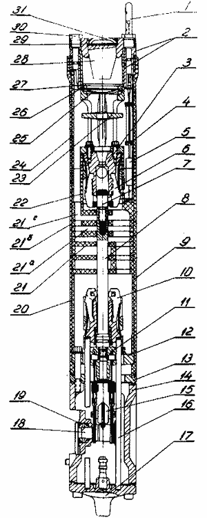 Рис. 1. Полюс выключателя типа АК. 1 – Маслоуказатель. 2 – Вывод. 3 – Верхний розеточный контакт. 4 – Кондуктор поплавка. 5 – Поплавок. 6 – Контактный палец. 7 – Контактная наставка. 8 – Контактный стержень. 9 – Нижний цилиндр. 10 – Нижний розеточный контакт. 11 – Ползун. 12 – Металлический перстень. 13 – Вывод. 14 – Картер. 15 – Амортизатор. 16 – Кондуктор. 17 – Крышка. 18 – Командная ось. 19 – Манжетное уплотнение. 20 – Внешний цилиндр. 21 – Дугогасительная камера. 21а – Диск №2. 21б – Диск №3. 21в – Диск №1. 22 – Труба. 23 – Держатель. 24 – Верхний цилиндр. 25 – Мембрана. 26 – Шайба. 27 – Предпазное кольцо. 28 – Маслоуловитель. 29 – Крышка. 30 – Пробка. 31 – Предохранительный колпак. |
