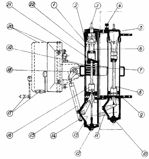 После этих предварительных операций двумя работниками передняя плита снимается легким равномерным постукиванием вместе с кулачком 17 и звездочкой 7.
