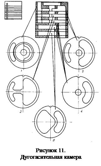 Конструкция полюсов для различных номинальных токов и номинальных токов отключения одна и та же, меняются лишь размеры, от которых они зависят. Исключение делает выключатель на номинальный ток 2000 А, при котором параллельно основному полюсу имеется шунтирующий полюс 8. В этом выключателе включение шунтирующего полюса, который связан с основным полюсом отключения при помощи соединительной штанги 11, производится с некоторым опозданием по отношению основного полюса. При отключении имеется обратная последовательность – шунтирующий полюс размыкается раньше основного полюса. Таким образом, силовая электрическая цепь замыкается и размыкается только отключающим основным полюсом, который вполне одинаков с полюсом на номинальный ток 1250А.