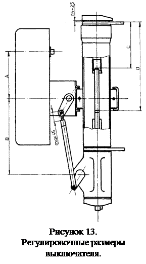 Регулирование хода якоря электромагнита F до начала воздействия на устройство отключения (5 - 6 мм) и зазора между штангой электромагнита и рычагом ключа 31 (1 - 2 мм) осуществляется с помощью винта 49.