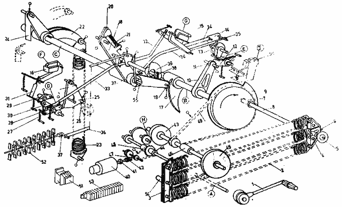 Отвинчивается болт М 6 и снимается указатель положения 5. После этого снимаются охранное пружинное кольцо для вала Ø 25 и шайбы с оси 8, а также охранное кольцо для вала Ø 25, находящееся на оси 54 впереди связкой 3. Болт 6 отвинчивается до конца. Пружины снимаются постепенно и равномерно с обеих сторон с осей 54 и 8. Необходима осторожность и из-за предварительного натяжения пружин.