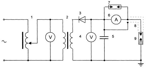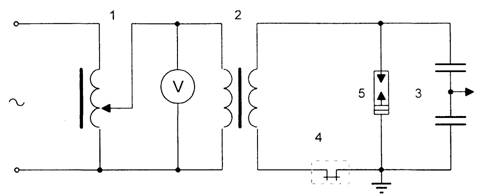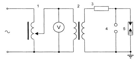 1 - регулировочный трансформатор; 2 - испытательный трансформатор; 3 - токоограничивающий резистор; 4 - искровой разрядник; 5 - измеряемый разрядник
