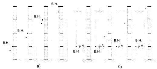 Рис. 9.3. Схемы измерения тока проводимости разрядника из нескольких элементов с не заземленным высоковольтным электродом (а) и с заземленным (б).