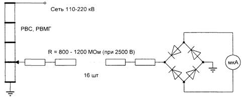 Этот метод контроля заключается в измерении тока через нелинейные сопротивления специальной штанги, которые подсоединяются параллельно нижнему (первому от "земли" ) элементу разрядника.