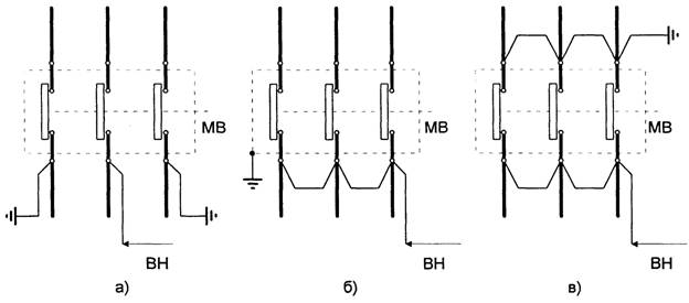 - к среднему полюсу масляного выключателя во включенном его положении при заземленных крайних полюсах. Этим проверяется междуфазовая изоляция выключателя;