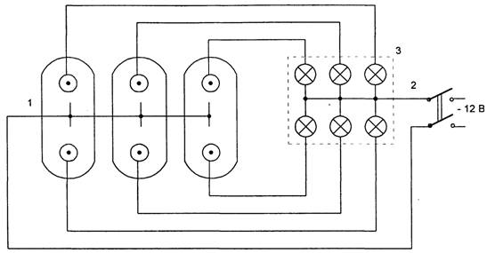 1 - подвижный контакт выключателя; 2 - рубильник; 3 - сигнальные лампы.