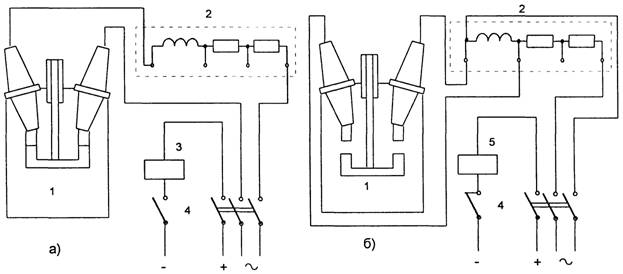 Рис. 4.8. Схемы измерения времени отключения (а) и включения (б) масляного выключателя.