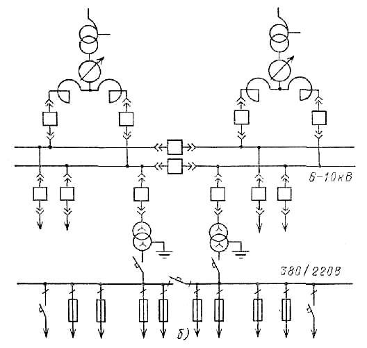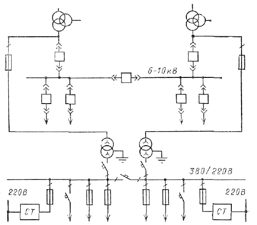 На рисунке 1,2 показаны схемы с. н. подстанций, применяемые в зависимости от вида оперативного тока. При переменном и выпрямленном токе рекомендуется схема (рис. 1), согласно которой предусматривается непосредственное подключение трансформаторов с. н. к обмоткам низшего напряжения главных трансформаторов. Такое подключение обеспечивает питание сети оперативного тока и производство операций выключателями при отключении шин 6—10 кВ. При постоянном оперативном токе наибольшее распространение имеет схема, показанная на рис. 2, когда трансформаторы с. н. непосредственно подключаются к шинам 6— 10 кВ.