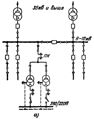 На сравнительно небольших понижающих подстанциях 35 кВ с вторичным напряжением 6 – 10 кВ для питания собственных нужд устанавливают, один трансформатор с вторичным напряжением 380/220 – рисунок №4. В случае необходимости резервирование питания может осуществляться от ближайшей городской или заводской сети, с напряжением которой и должно быть согласовано вторичное напряжение трансформатора собственных нужд.