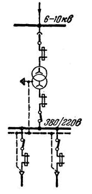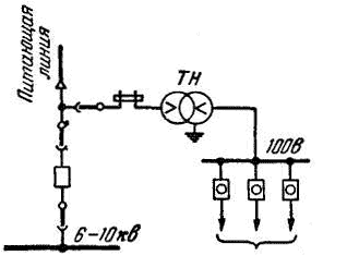 Мощность, потребляемая на собственные нужды подстанций, обычно не превышает 50 – 200 кВт (последнее при наличии крупной трансформаторной ремонтной мастерской и масляного хозяйства). Несколько больше может быть расход мощности при наличии на подстанции синхронных компенсаторов. В ряде случаев от установки собственных нужд подстанции питается также жилой поселок при ней. Наиболее ответственными механизмами собственных нужд подстанций на переменном токе являются вентиляторы искусственного охлаждения мощных трансформаторов. Все остальные ответственные потребители собственных нужд подстанции постоянно питаются от аккумуляторных батарей или резервируются от них (как аварийное освещение). На подстанциях с установленными электромагнитными приводами на стороне высшего напряжения и при отсутствии аккумуляторной батареи устанавливается трансформатор на питающей линии (рис.4).
