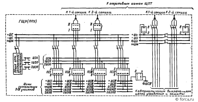 На щите постоянного тока создается секционированная система оперативных шинок. От этих шинок питаются шинки управления +ШУ, – ШУ, +ШУ (через переключатель) и (+) ШМ — мигающий плюс, шинки сигнализации + ШС, —ШС, (+) ШМ щита управления. Шинки разделены рубильниками на две секции, нормально находящиеся под напряжением, одна из них в работе, другая в резерве. При исчезновении напряжения на одной из них персонал вручную производит переключение.