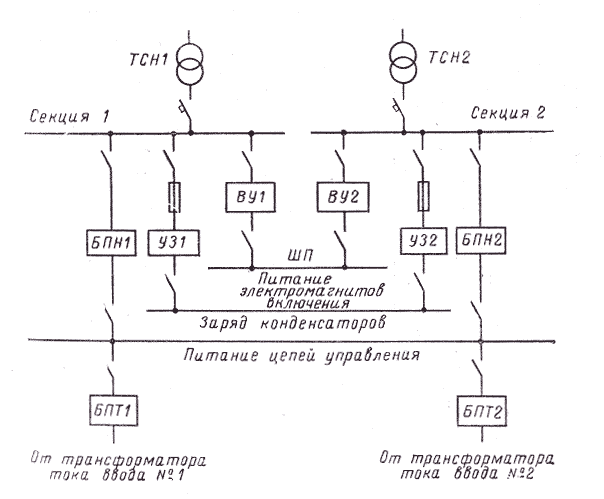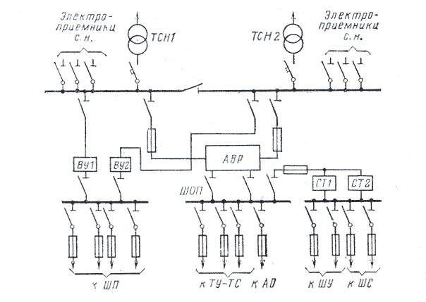 Питание наиболее ответственных электроприемников оперативного тока должно обеспечиваться устройствами автоматического включения резервного питания (АВР). На рисунке 1 показана схема питания оперативных цепей переменным током от двух трансформаторов с. н. ТСН 1 и ТСН 2.