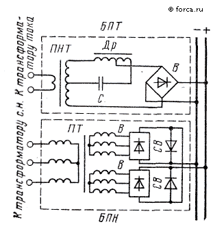Блоки БПТ (рисунок 2) состоят из промежуточного насыщающегося трансформатора ПНТ, выпрямительного моста В, а также вспомогательных элементов: дросселя Др и конденсатора С, включенных в схему для стабилизации выходного напряжения.