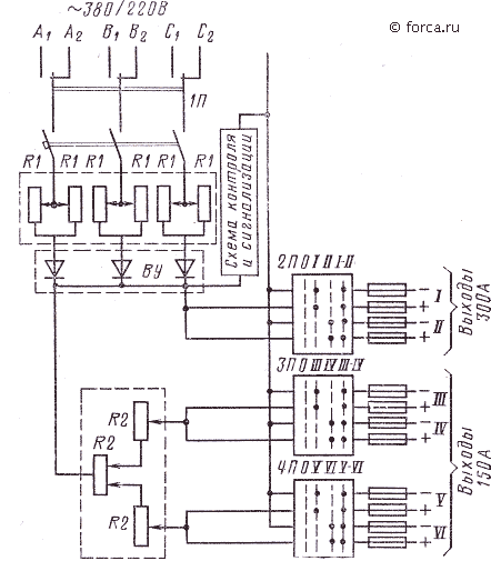 Ток на выходе блоков БПРУ регулируется резисторами переменного сопротивления в цепях переменного R1 и постоянного R2 тока в диапазоне: 55—150 и 150—300 А. Блоки имеют по два выхода до 300 А (I к II) и по четыре выхода до 150 А (III - IV).