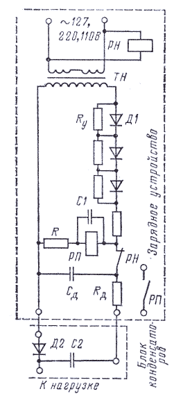 Для заряда конденсаторов применяются зарядные выпрямительные устройства, например У3-401, в качестве предварительно заряженных конденсаторов — блоки конденсаторов БК-400, БК-401, БК-402, а также блоки БПЗ-401 и БПЗ-402, которые содержат в себе зарядное устройство и блок конденсаторов. На рисунке 4 показана упрощенная схема источника выпрямленного тока, основными частями которого являются устройство УЗ-401 и блок БК-401 емкостью 40 мкФ. Зарядное устройство состоит из трансформатора напряжения ТН, выпрямителя (диода) Д1 с уравнительными резисторами Rу, схемы контроля наличия напряжения на вводе устройства (реле РН и РП), конденсатора С1, резистора R и дополнительного резистора Rд и конденсатора Сд. Блок конденсатора состоит из диодов Д2 и металлобумажного конденсатора С2.