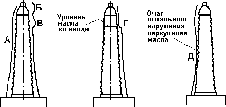 нормальное распределение температуры (А); распределение температуры при наличии короткозамкнутого контура в маслорасширителе (Б); при перегреве внутренних контактных соединений (В); при понижении уровня масла (Г); при нарушении циркуляции масла (разбухание бумажного остова на токоведущем стержне, шламообразование и т.п.) (Д).